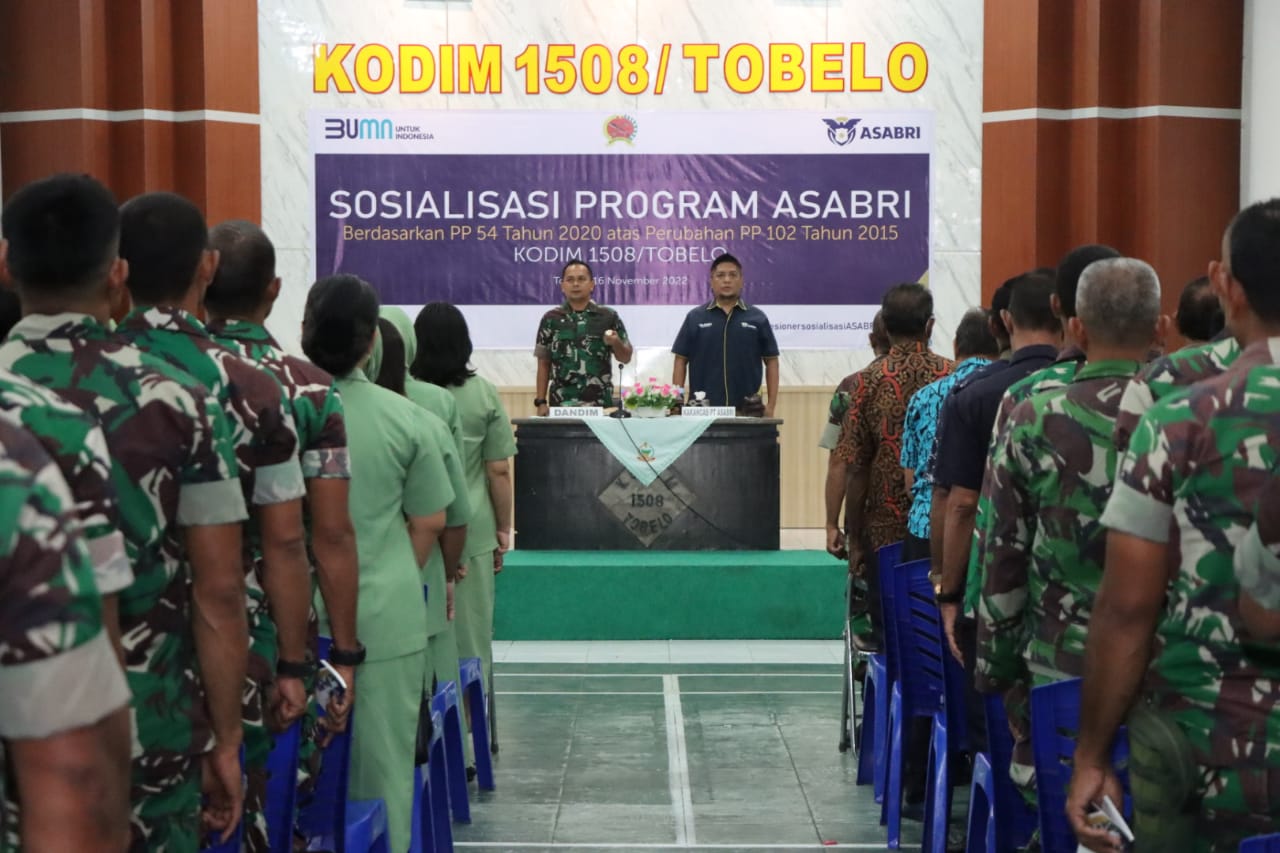 TOBELO, HR—- Prajurit Kodim 1508/Tobelo, Subdenpom Tobelo, Polres Halmahera Utara dan perwakilan Persit KCK Cabang XXXI Kodim 1508/Tobelo menerima sosialisasi Program Asabri sesuai dengan Peraturan Pemerintah Nomor 102 Tahun 2015 telah diubah dalam Peraturan Pemerintah Nomor 54 Tahun 2020. Bertempat di aula Kodim 1508/Tobelo Desa MKCM Kecamatan Tobelo Kabupaten Halmahera Utara, Rabu (16/11/2022).