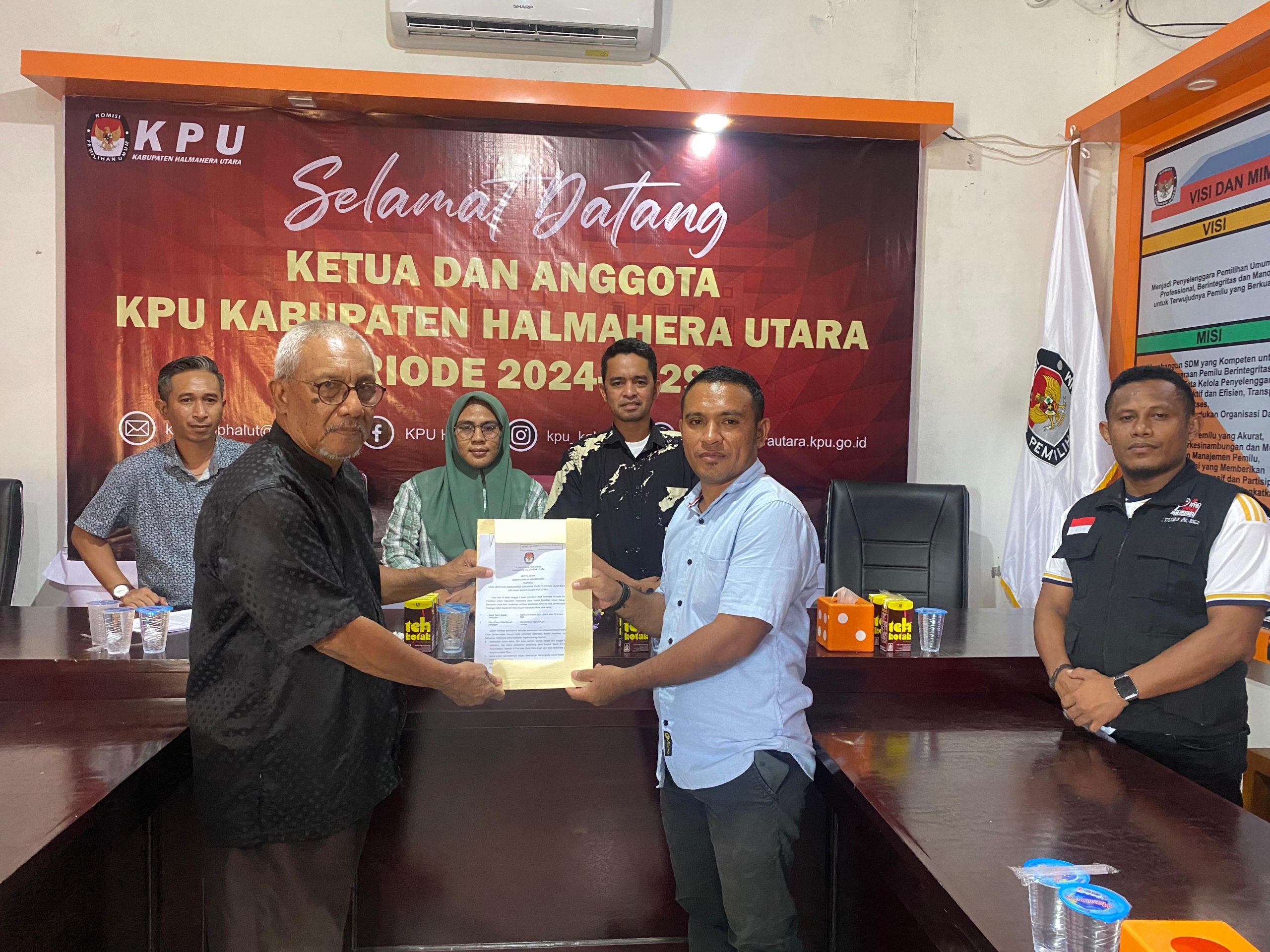 TOBELO, HR — Komisi Pemilihan Umum (KPU) Halmahera Utara (Halut), telah selesai melakukan rekapitulasi sekaligus penyerahan berita acara hasil verifikasi administrasi (Vermin), syarat dukungan Bakal Calon (Bacalon) perseorangan, kepada pasangan calon bupati dan wakil bupati, Abdul Rahman Sidi Umar dan Oxaverius Kojoba, Minggu (2/6/2024).