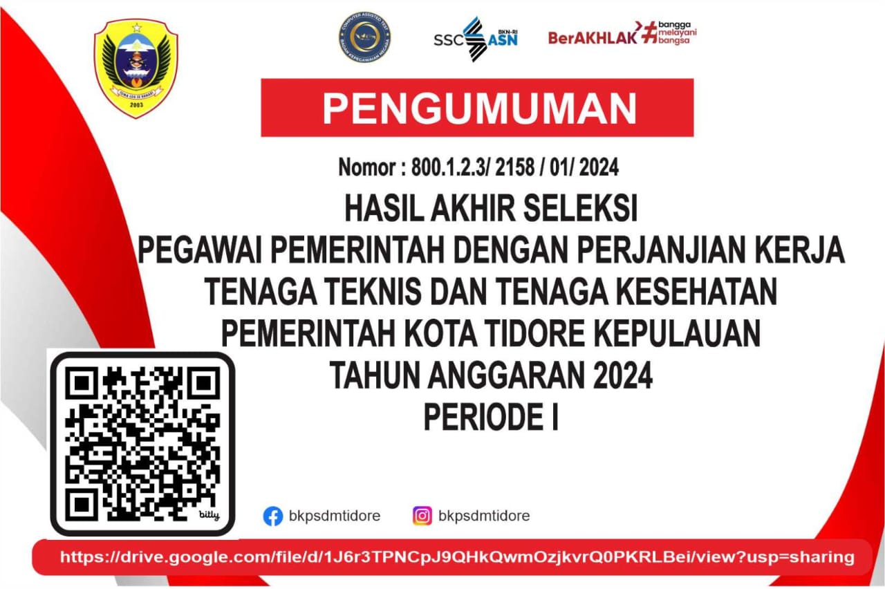 Lebih lanjut, Rusdy mengatakan, terkait informasi pengumuman hasil seleksi kompetensi Pegawai Pemerintah dengan Perjanjian Kerja (PPPK) Tenaga Teknis dan Tenaga Kesehatan Tahap I untuk Formasi Tahun 2024 dapat diakses melalui link yang telah diumumkan oleh BKPSDM Kota Tidore Kepulauan https://drive.google.com/file/d/1J6r3TPNCpJ9QHkQwmOzjkvrQ0PKRLBei/view?usp=sharing