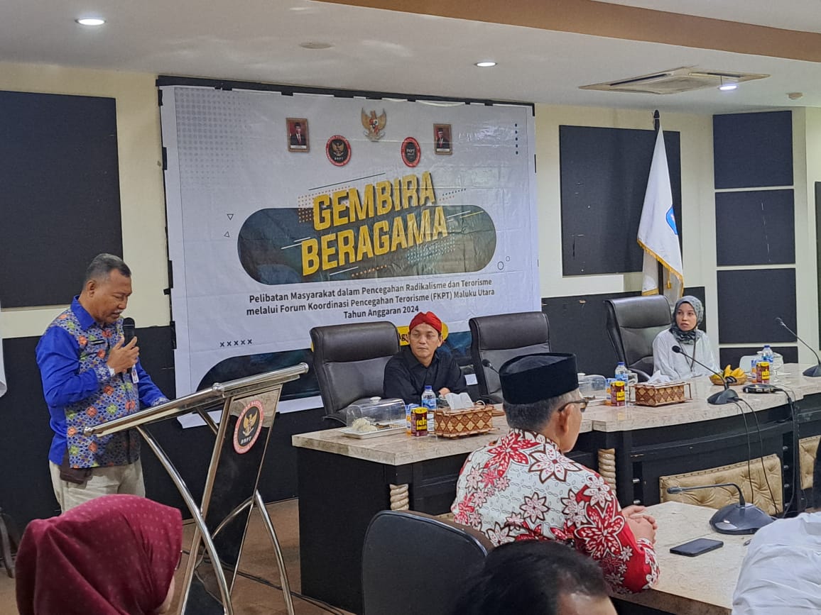 TOBELO, HR — Badan Nasional Penanggulangan Terorisme (BNPT) melalui, Forum Koordinasi Pencegahan Terorisme’ (FKPT) Maluku Utara menggelar kegiatan yang bertajuk “Gembira Beragama” Gerakan Muda Gembira Bernegara dan Beragama, Pelibatan Masyarakat dalam pencegahan Radikalisme dan Terorisme, bertempat di Ruang Rapat Fredy Tjandua Lantai II kantor Bupati Halmahera Utara, Sabtu, (24/08/2024).