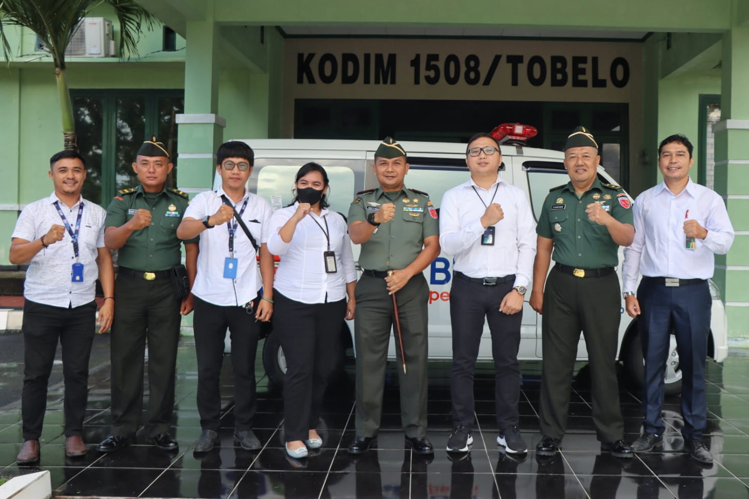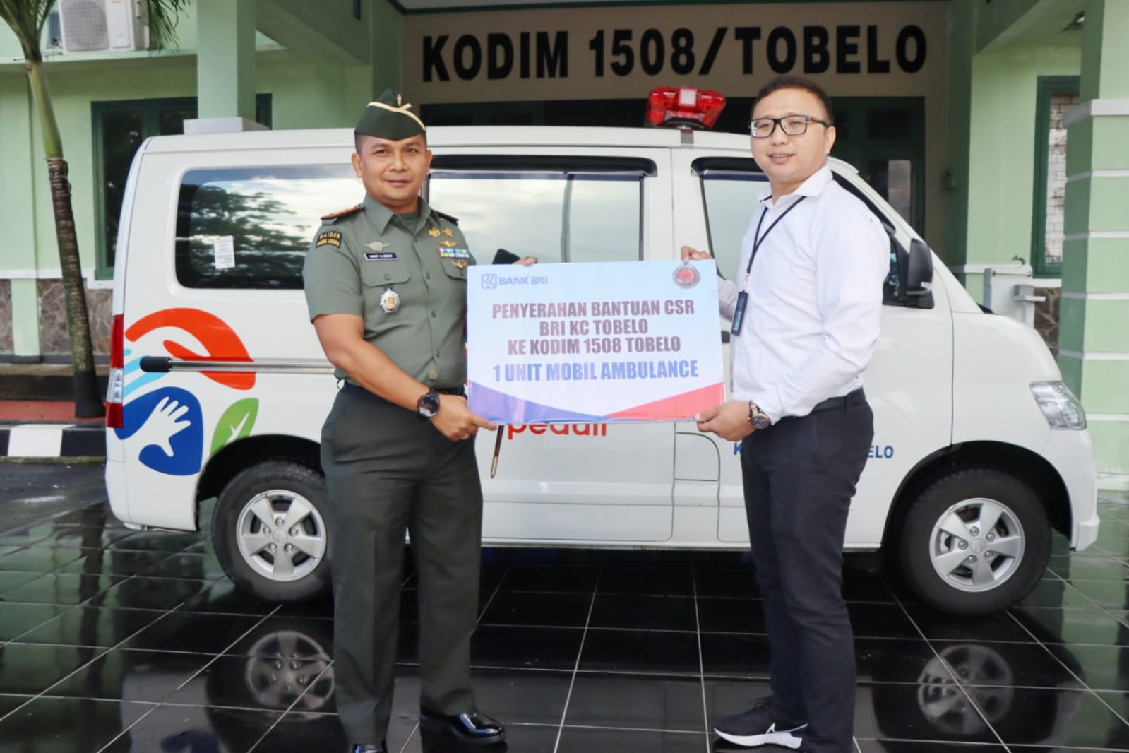 TOBELO, HR — Bank BRI Cabang Tobelo Kabupaten Halmahera Utara menyalurkan bantuan satu unit mobil ambulance kepada Kodim/1508 Tobelo, di Markas Kodim 1508/Tobelo, Jalan kawasan Pemerintahan desa MKCM kecamatan Tobelo. Senin (10/07/2023).