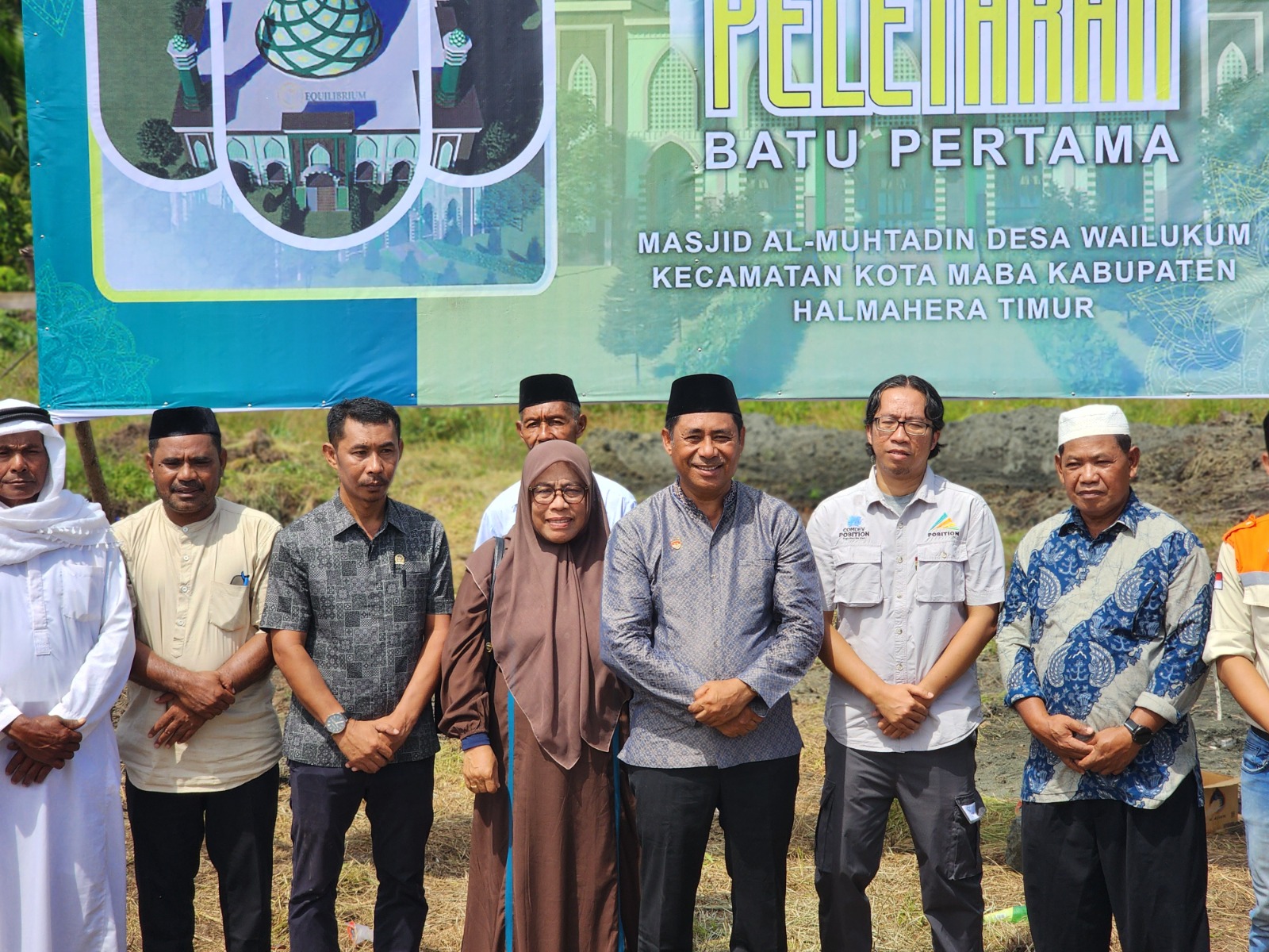MABA–Bupati Halmahera Timur, Drs. Ubaid Yakub, MPA., didampingi Ketua Tim Penggerak PKK Hj. Sitinur Ubaid, bersama jajaran Pimpinan OPD dan Sekretaris Komisi III DPRD, menghadiri prosesi peletakan batu pertama pembangunan Masjid Al-Muhtadin di Desa Wailukum, Kecamatan Kota Maba, Jumat (17/04).