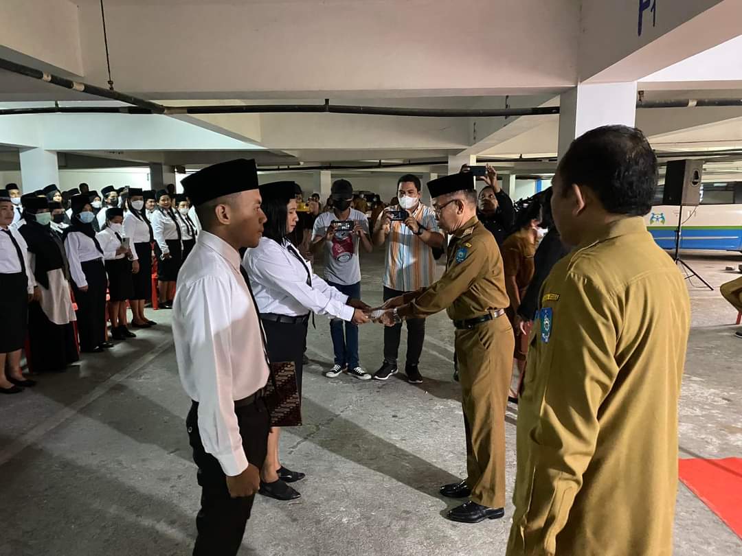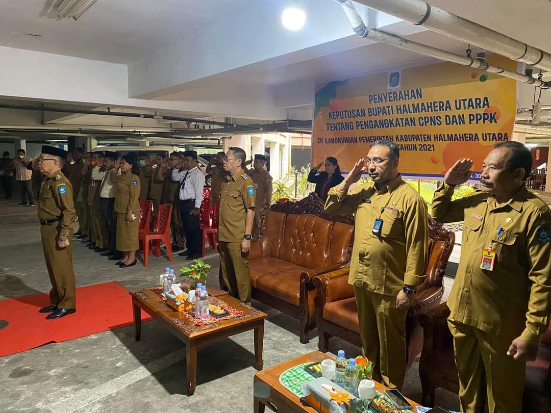 TOBELO, HR—- Bupati Halmahera Utara Frans Manery menyerahkan Surat Keputusan (SK) Pengangkatan Calon Pegawai Negeri Sipil (CPNS) kepada 179 orang dan 70 Pegawai Pemerintah dengan Perjanajian Kerja (PPPK) formasi tahun 2021 di lingkungan Pemerintah Kabupaten Halmahera Utara.
