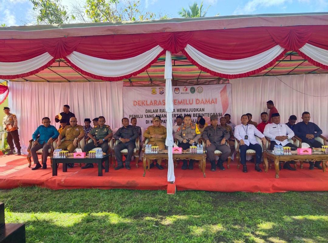 TALIABU,HR– Bupati Pulau Taliabu, Maluku Utara, Aliong Mus, menghadiri Deklarasi Pemilu Damai dalam rangka mewujudkan pemilu yang aman, tertib dan berintegritas yang diinisiasi Polres Taliabu, Senin (16/10) pagi.