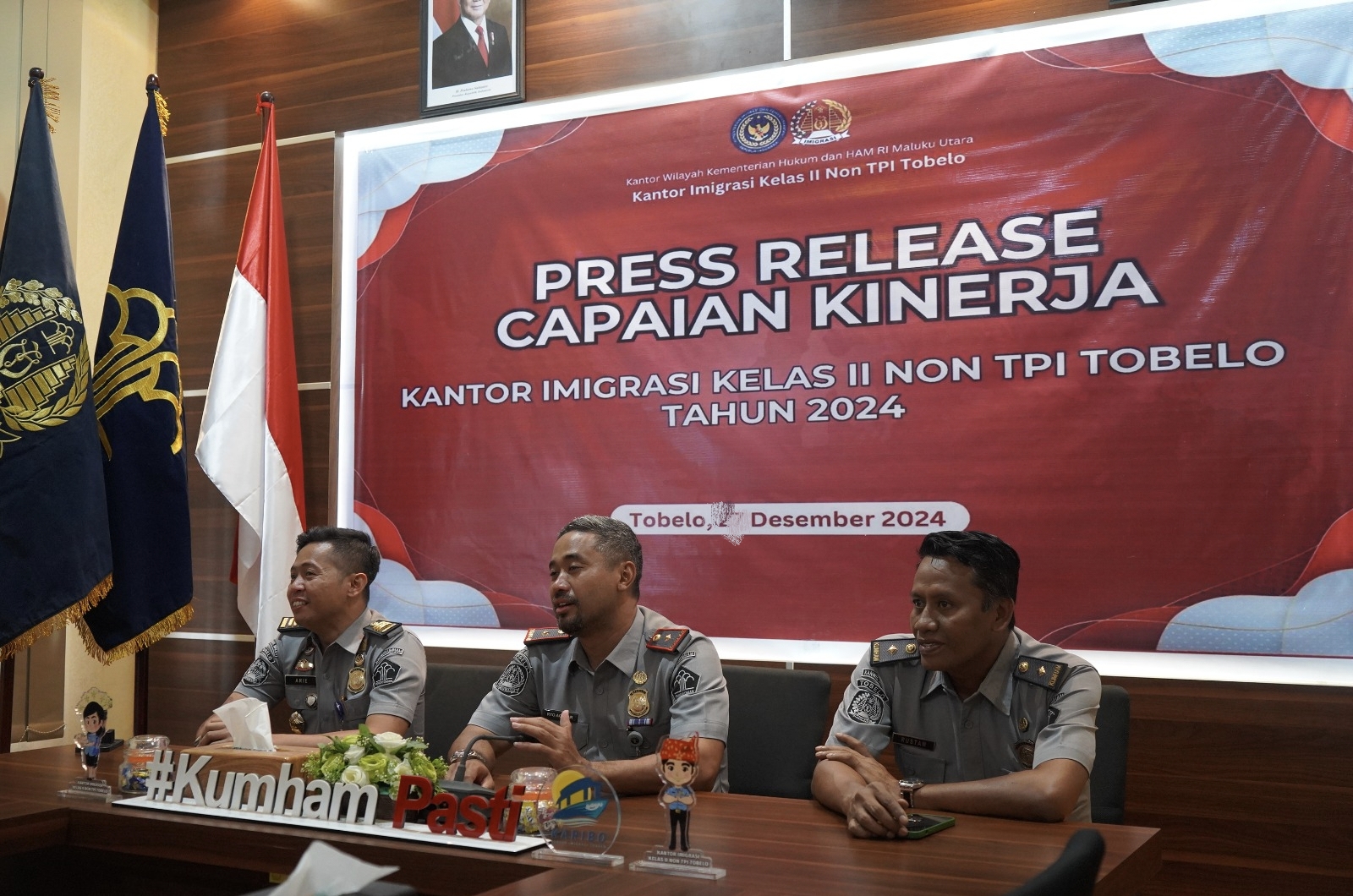 Kantor Imigrasi Kelas II Non TPI Tobelo Kabupaten Halmahera Utara, Maluku Utara menggelar konferensi pers mengenai realisasi capaian kinerjanya sepanjang tahun 2024 di ruang Aula Rapat Kantor Imigrasi, selasa (31/12/2024).