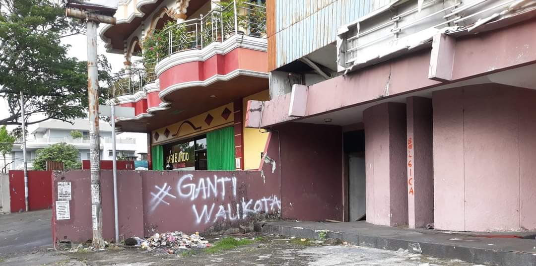 Dari pantauan media ini, coret – coretan itu berada di sisi kiri dan kanan Pelabuhan Perikanan Bastiong coretan bertuliskan #Ganti Wali Kota.