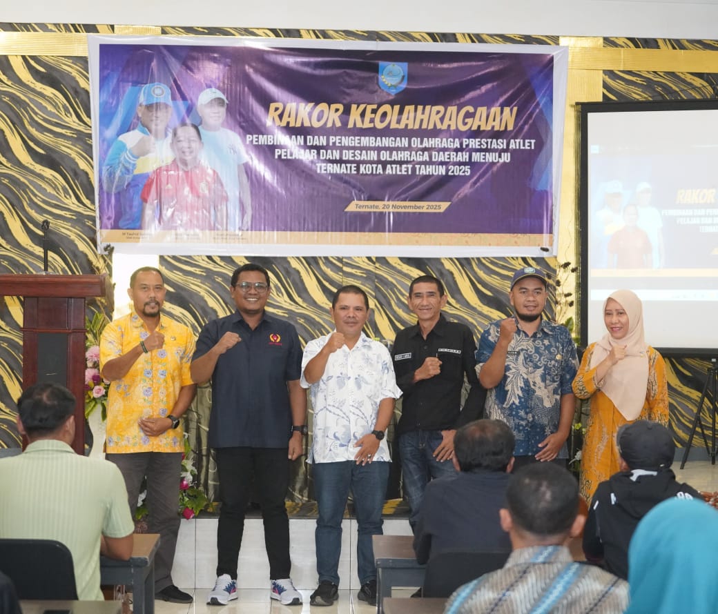 TERNATE, HR – Dinas Pemuda dan Olahraga (Dispora) Kota Ternate melaksanakan rapat koordinasi (Rakor) keolahragaan dengan tema “Pembinaan dan Pengembangan Olahraga Prestasi Atlet Pelajar dan Desain Olahraga Daerah Menuju Ternate Kota Atlet” tahun 2025, di Hotel Surya Pagi, Kamis (20/11/2025).