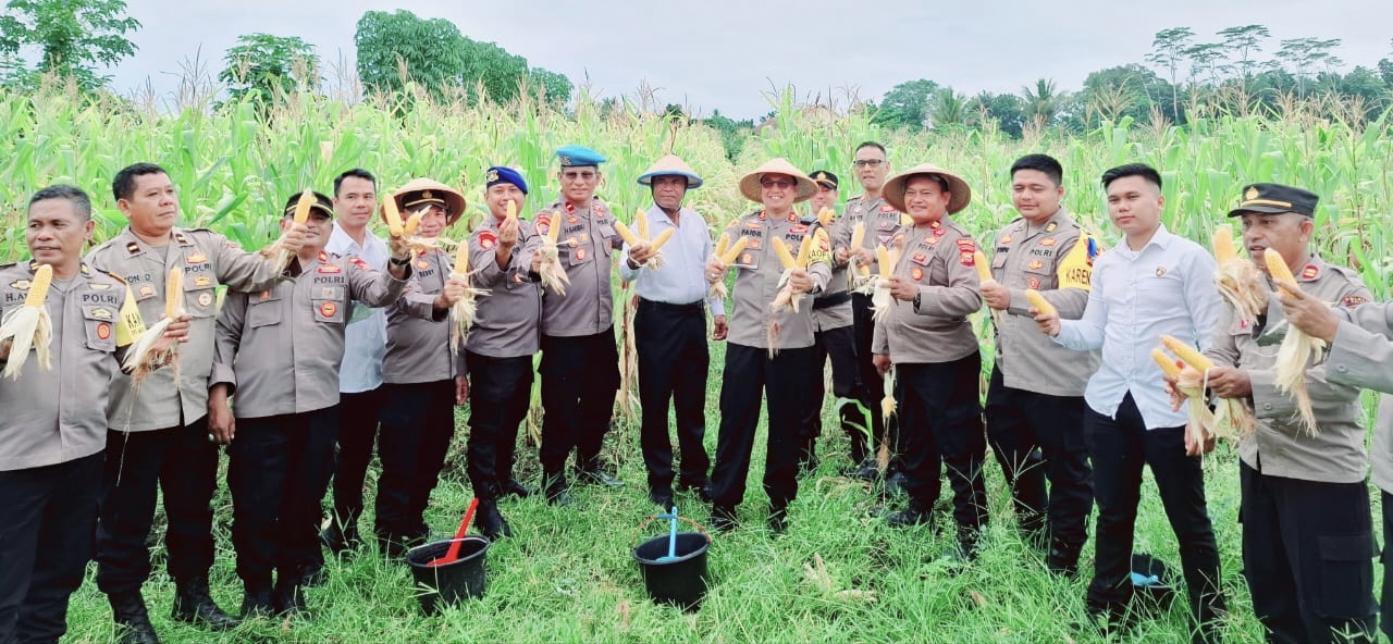 TOBELO, HR — Dalam rangka mendukung program pemerintah di bidang Ketahanan Pangan, Polres Halmahera Utara, Polda Maluku Utara melaksanakan panen Perdana jagung dilahan yang berada di kawasan Komplek Mako Polres Halmahera Utara, Senin (17/02/2025).