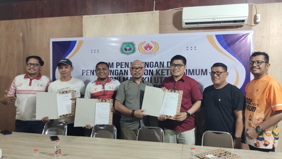TERNATE, HR – Ketua Umum Komite Olahraga Nasional Indonesia (KONI) Kota Ternate, Faujan A. Pinang dan Sekretaris Jenderal Asosiasi Provinsi (ASPROV) PSSI Maluku Utara, Aldy Ali secara resmi mengambil formulir bakal calon Ketua Umum KONI Provinsi Malut, Kamis (25/9/2025).
