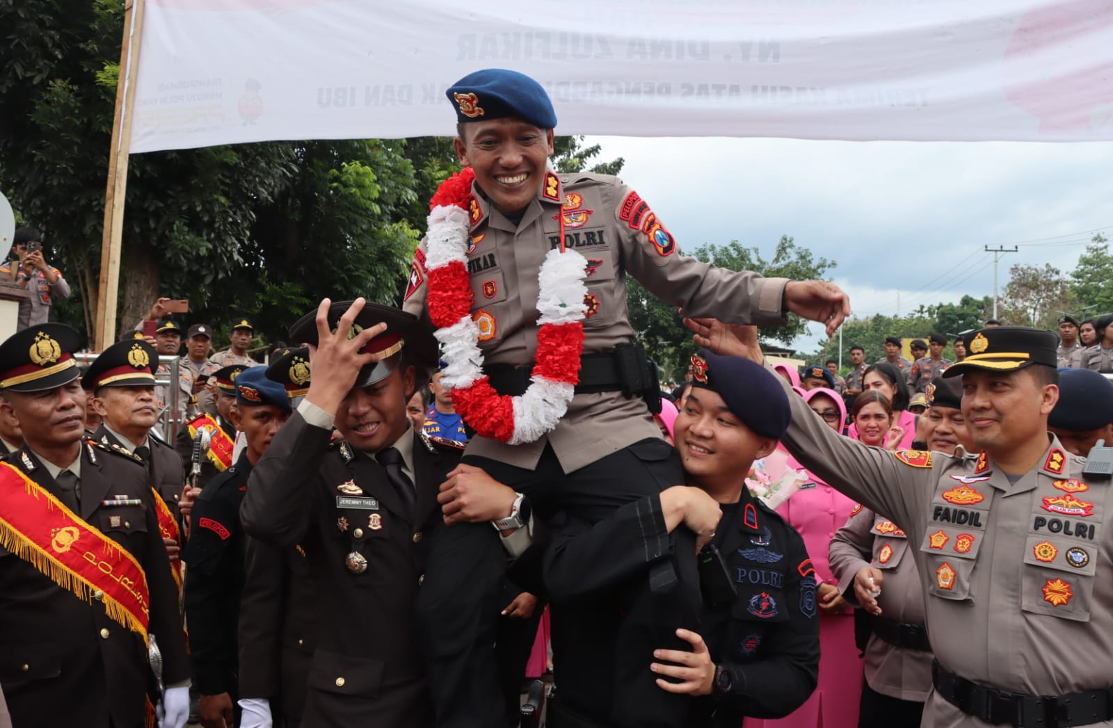 Kapolres Halmahera Utara AKBP Faidil Zikra, SH. SIK disambut dengan prosesi pedang pora. Dia didampingi oleh isterinya dan diikuti oleh AKBP Moh. Zulfikar Iskandar, SIK yang dipromosikan untuk menjadi Wadansat Brimob Polda Jawa Timur.