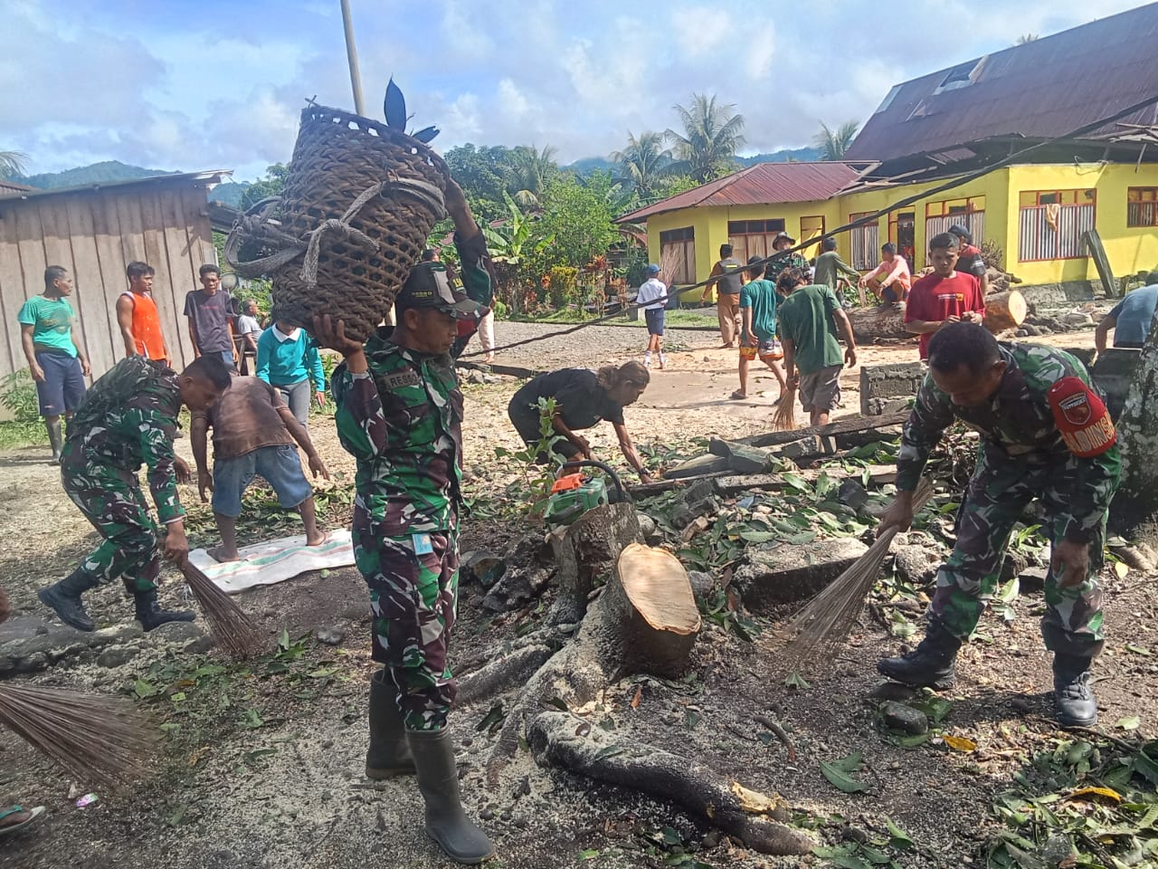 Musibah tersebut mengakibatkan sejumlah rumah warga mengalami kerusakan, mulai dari atap beterbangan hingga pohon tumbang yang menutup akses jalan. Tanpa menunggu instruksi lebih lanjut, Danramil dan sejumlah personel segera bergerak ke lokasi untuk memberikan bantuan tanggap darurat.