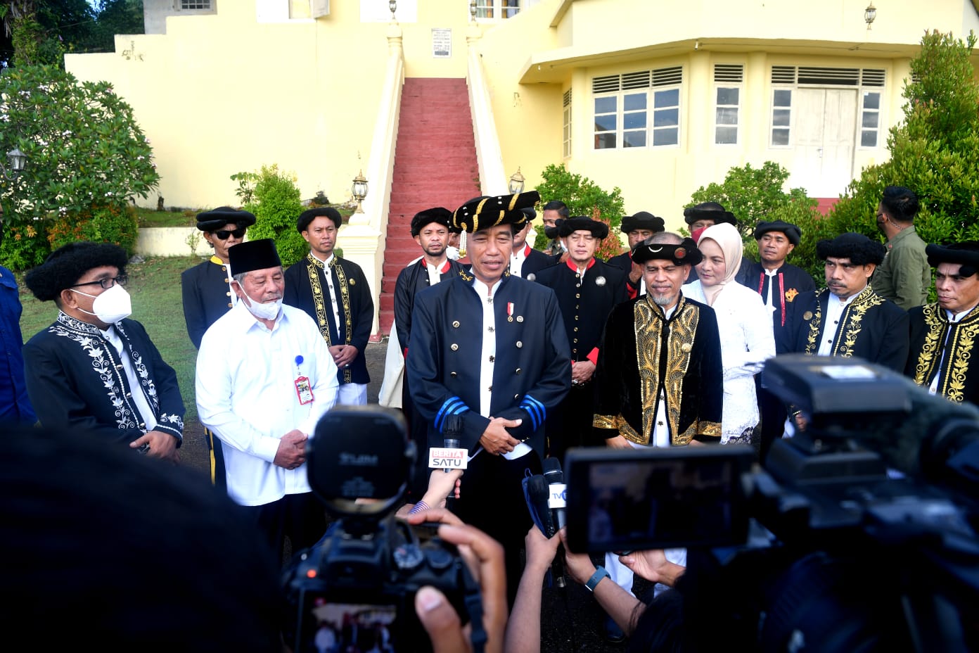TERNATE, HR – Presiden Joko Widodo menerima anugerah gelar adat “Dada Madopo Malamo” dari Kesultanan Ternate di Kedaton Sultan Ternate, Kota Ternate, Provinsi Maluku Utara, pada Rabu, 28 September 2022. Menurut Presiden, penganugerahan gelar adat ini merupakan bagian dari tradisi dan kearifan lokal yang harus dilestarikan.