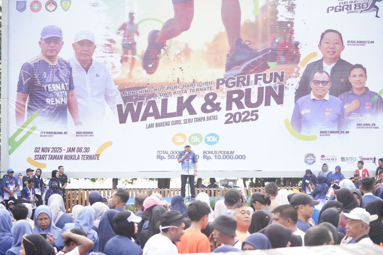 TERNATE, HR – Wali Kota Ternate M Tauhid Soleman melaunching Hari Ulang Tahun (HUT) Persatuan Guru Republik Indonesia (PGRI), Hari Guru Nasional (HGN) tahun 2025 dan Dharma Wanita Persatuan (DWP) Kota Ternate, di Taman Nukila, Minggu (2/11/2025).