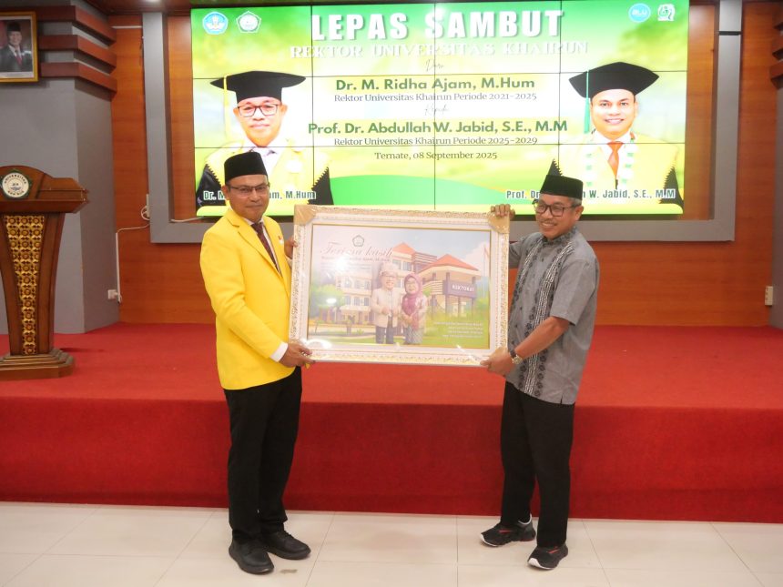 Lepas sambut antara Rektor Unkhair periode 2021-2025 Dr. M Ridha Ajam, M.Hum, kepada Rektor Unkhair periode 2025-2029 Prof. Dr. Abdullah W Jabid, SE.,MM., kemudian Ketua DWP Unkhair periode 2021-2025 Bekti Nirmala kepada Ketua DWP Unkhair periode 2025-2029 Lasmiyati Abdullah, ini dihadiri para wakil rektor, dekan, dosen, serta pegawai di lingkungan Unkhair.