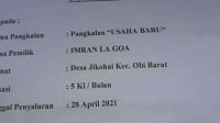 LABUHA,HR– Sebanyak lima ton bahan bakar minyak (BBM), jenis Minyak tanah (Mita) milik PT Sinergi Darma Negeri (PT SDN) yang beroprasi di kabupaten Halmahera Selatan diduga bermasalah, pasalnya Mita yang tadinya akan dikirim ke desa Jikohai kecamatan Obi barat, melalui pangkalan minyak bernama Usaha Baru dengan nama pemilik pangkalan Imran La Goa tidak masuk dalam kontrak kerja sama dengan PT SDN, selain itu mobil Tanki yang mengangkut BBM tersebut bernomor polisi L 9755 CC milik PT Halutindo Perkasa pada Rabu 28 April 2021, diduga mobil angkutan BBM jenis bensin bukan minyak tanah.