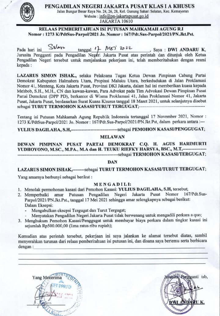 Isi putusan MA tertanggal 17 November 2021 nomor : 1273 K/PdtSus-Parpol/2021 Jo nomor :167/PdtSus-Parpol/2021/PN.Jkt.Pst dengan amarnya berbunyi,” Mengadili, menolak permohonan kasasi dari pemohon Yulius Dagilaha,” bunyi keputusan yang dikutip dari situs Kepaniteraan MA, Selasa (17/05/2022).