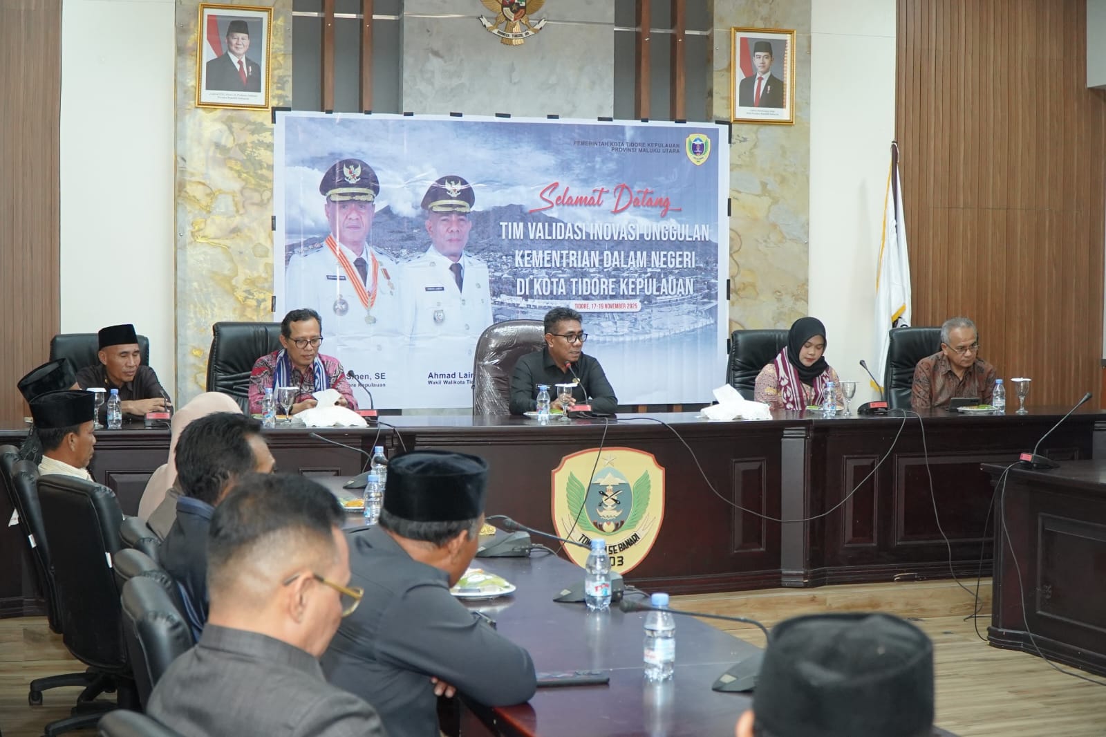 TIDORE, HR – Wakil Wali Kota Tidore Kepulauan Ahmad Laiman menerima langsung kedatangan tim uji petik inovasi Kementerian Dalam Negeri. Kedatangan tim Kemendagri tersebut guna melakukan validasi lapangan terhadap dua inovasi unggulan pada Pemerintah Daerah Kota Tidore Kepulauan, bertempat di Ruang Rapat Wali Jota Tidore Kepulauan, Senin (17/11/2025).