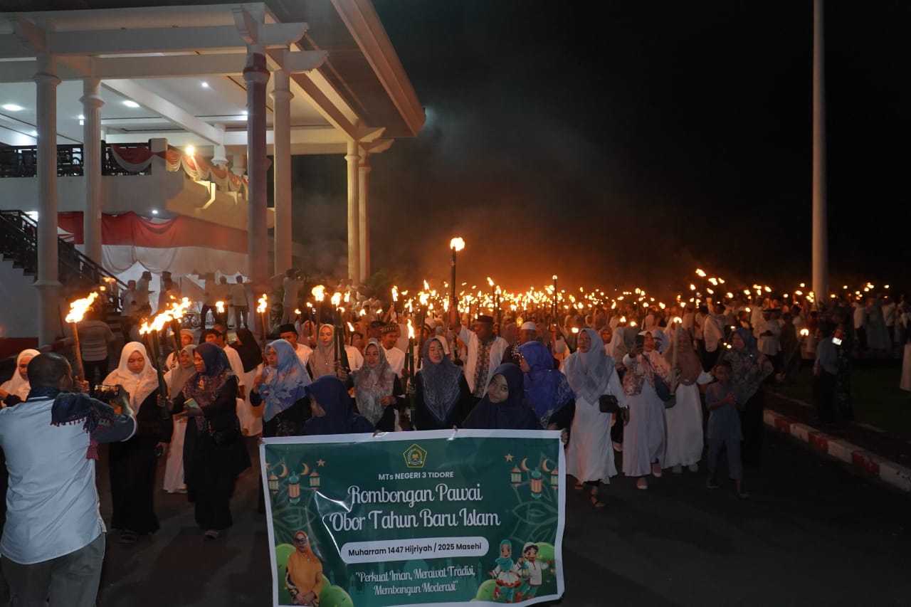 TIDORE, HR – Dalam rangka memeriahkan Tahun Baru Islam 1447 Hijriyah/2025 Masehi, Pemerintah Kota Tidore Kepulauan menggelar pawai obor yang dilepas secara resmi oleh Sekretaris Daerah Ismail Dukomalamo di Halaman Kantor Wali Kota, Jumat (4/7/2025) pekan kemarin.