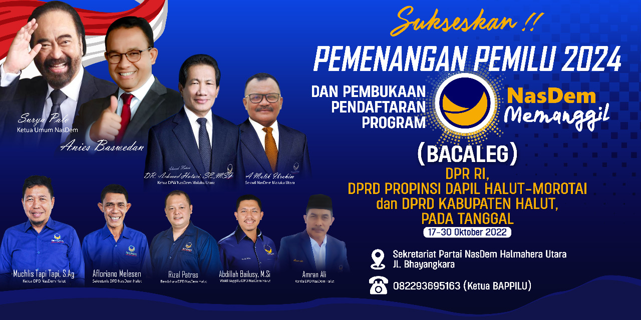 Ketua Bapilu DPD Partai NasDem Halmahera Utara, Abdilla Bailusy mengatakan, pembukaan pendaftaran bacaleg ini sudah dimulai pada 17 Oktober 2022 dan berakhir hingga 30 Oktobet 2022. Pendaftaran bisa dilakukan di DPW, DPD dan DPP Partai NasDem yang terbuka untuk masyarakat umum.