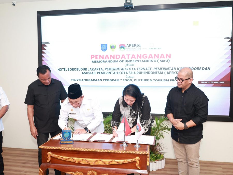 TERNATE, HR – Pemerintah Kota Ternate bersama Pemerintah Kota Tidore melakukan penandatanganan kerjasama dengan manajemen Hotel Borobudur Jakarta, untuk mempromosikan wisata unggulan kedua kota tersebut, Rabu (1/4/2026) di Aula Kantor Bappelitbangda.