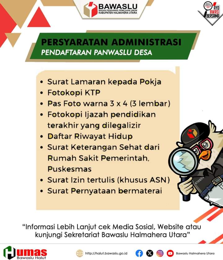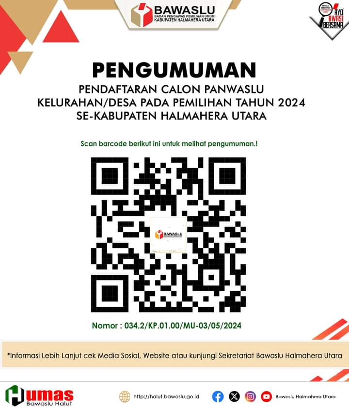 Pengumuman Pendaftaran Calon Anggota Panwaslu Kelurahan/Desa Pada Pemilihan Tahun 2024 Se Kabupaten Halmahera Utara halmaherarayaMei 18, 2024Juni 21, 20241,360 views Pos terkaitWarga Yang Kehilangan Motor di Himbau Datang ke Mapolres HalutPolres Halmahera Utara Berhasil Ungkap Kasus Pencurian dan PenggelapanLengkapi Berkas, Kejari Halut Periksa Saksi Kasus Dugaan Korupsi Gaji Fiktif Dinas Satpol PPKasus Dugaan Penistaan Agama, Oknum Polisi, Secara Kode etik di Limpahkan Ke Polda MalutPriska Tadjibu Tegaskan Dukungan Penuh kepada Ketua FKB dalam Percepatan Perda Perlindungan Petani di HalutKapolres Halut Sebut Berkas Kode Etik Oknum Polisi Diduga Menista Agama Sudah Lengkap