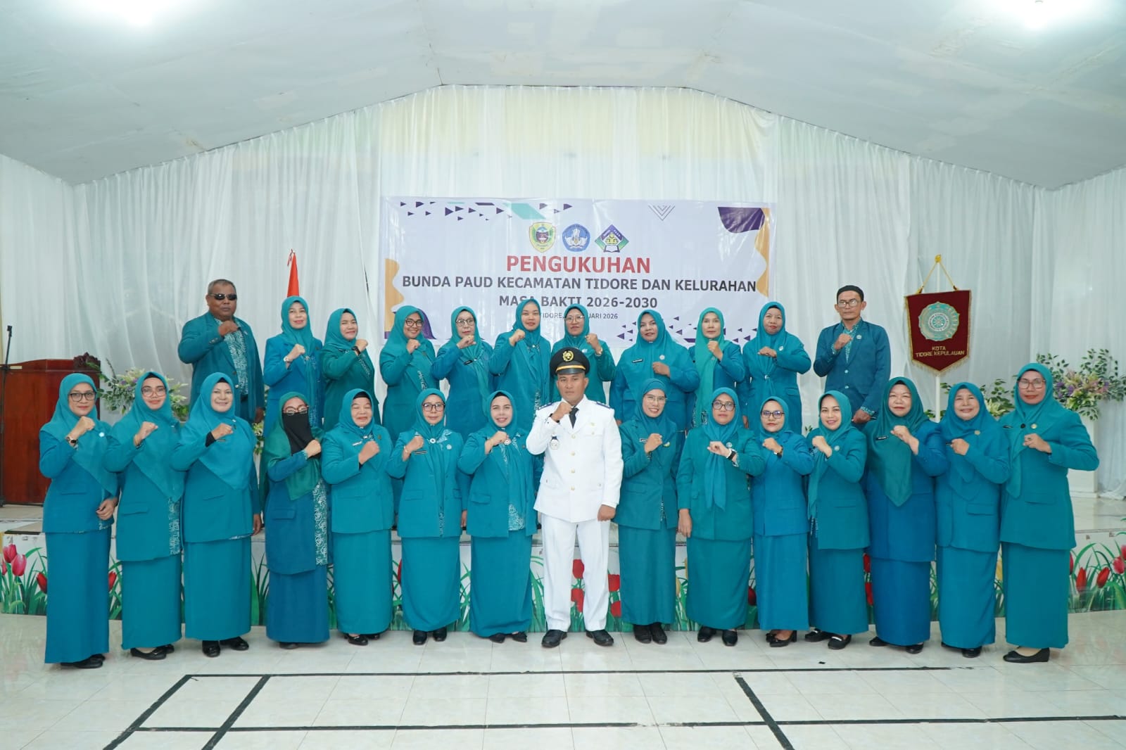 TIDORE,HR- Ketua Tim Penggerak PKK Kota Tidore Kepulauan Hj. Rahmawati Muhammad Sinen resmi melantik Ketua Tim Penggerak PKK Kecamatan Tidore Marliyani Sahril yang dirangkaikan dengan pengukuhan Bunda PAUD Kecamatan Tidore dan Kelurahan se-Kecamatan Tidore Masa Bakti 2026-2030, berlangsung secara khidmat di Aula Kantor Camat Tidore, Selasa (20/1/2026).