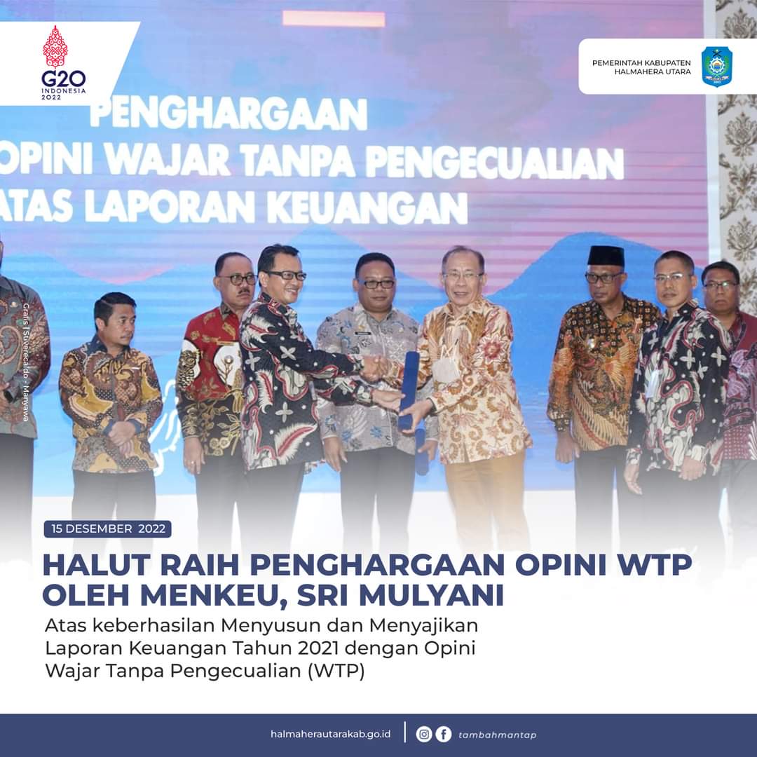 Pemberian penghargaan opini Wajar Tanpa Pengecualian (WTP) untuk Kabupaten Halmahera Utara sudah yang kelima kalinya sejak tahun 2017-2021 dirangkaikan dengan penyerahan DIPA buku alokasi TKD tahun anggaran 2023, yang diserahkan langsung oleh Gubernur Maluku Utara, KH. Abdul Gani Kasuba kepada Bupati Halmahera Utara, Frans Manery di Auditorium Nuku Kantor Gubernur Maluku Utara, Kamis (15/12/2022).