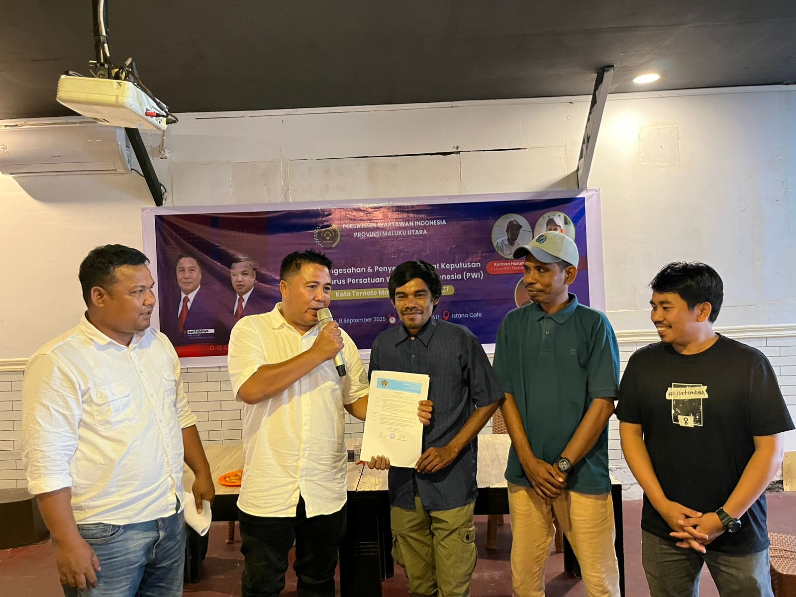 TERNATE, HR – Surat Keputusan (SK) pengurus Persatuan Wartawan Indonesia (PWI) Kota Ternate masa bakti 2025–2027 diserahkan oleh Persatuan Wartawan Indonesia (PWI) Maluku Utara, di Istana Cafe.