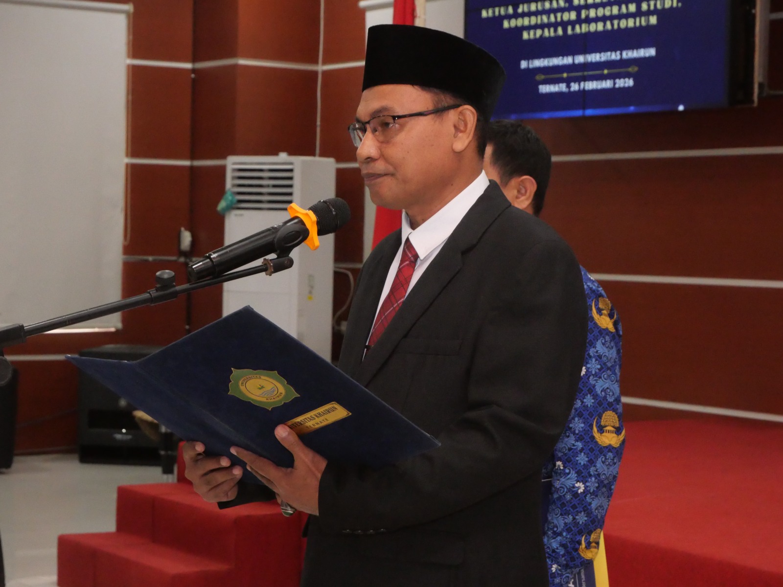 TERNATE,HP–-Peningkatan kualitas lulusan, kualitas dosen, mutu kurikulum dan pembelajaran, serta tata kelola yang akuntabel menjadi empat sasaran strategis ditekankan Rektor Universitas Khairun, Prof. Dr. Abdullah W. Jabid, SE, MM, saat melantik 99 pejabat, di Aula Nuku, Lantai IV Gedung Rektorat Kampus II Unkhair, Ternate, Kamis (26/2/2026).