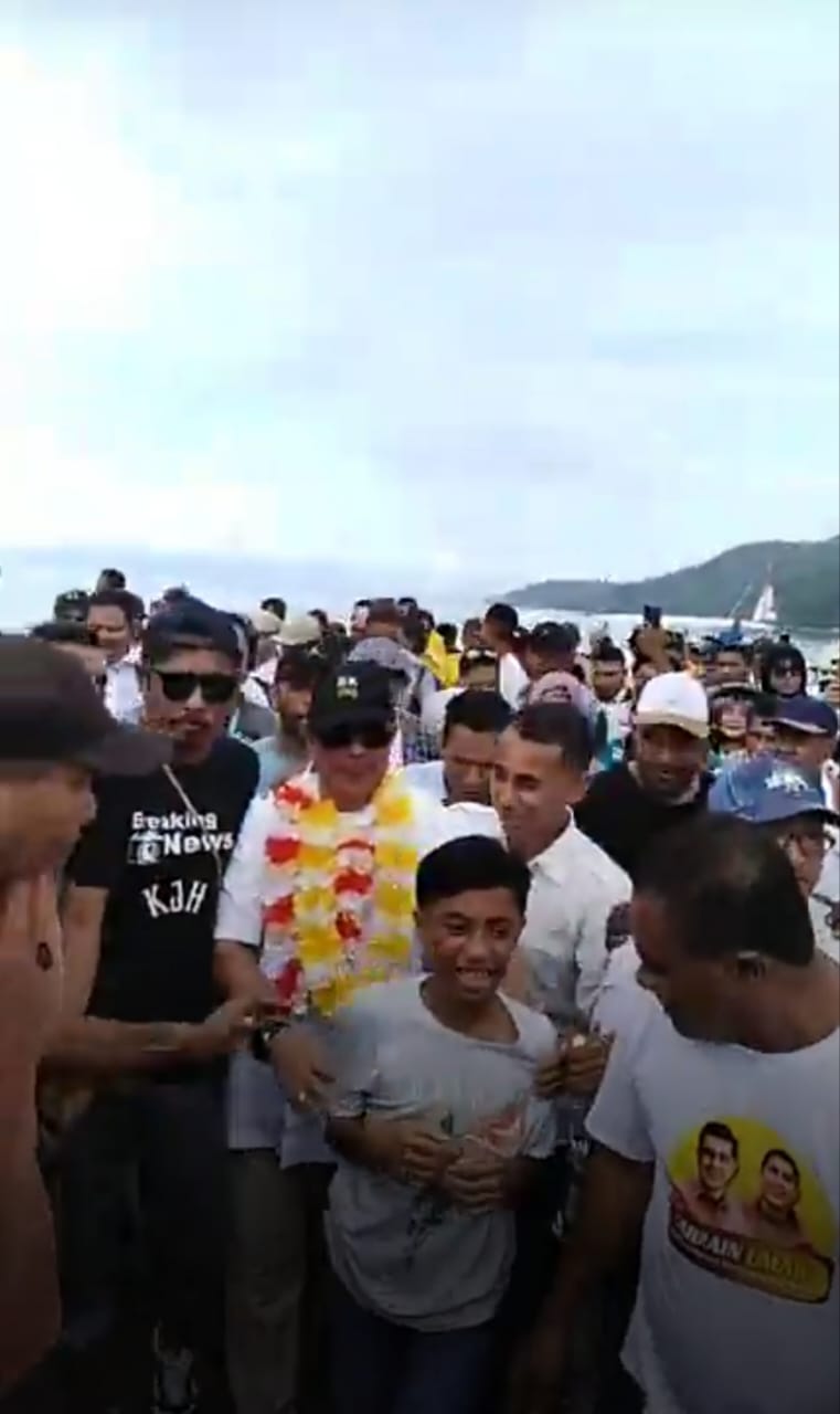 Pantauan Halmaheraraya. Id Bapaslon BK – UHS pasca tiba di dermaga, langsung diarak mengelilingi ibu kota Labuha oleh para tim dan simpatisan. (echa)