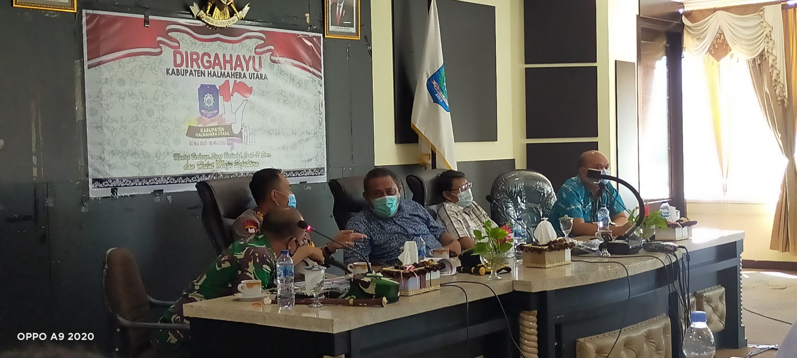 Rapat koordinasi dilanjutkan melalui video Confrensi (Vidcom) bersama Sekda Maluku Utara, Syamsudin A. Kadir, di hadiri, Kapolda Malut, Danrem 152 Babullah, Kepala Bandara Babullah Ternate, Komandan Pangkalan Udara Leo Watimena Morotai.