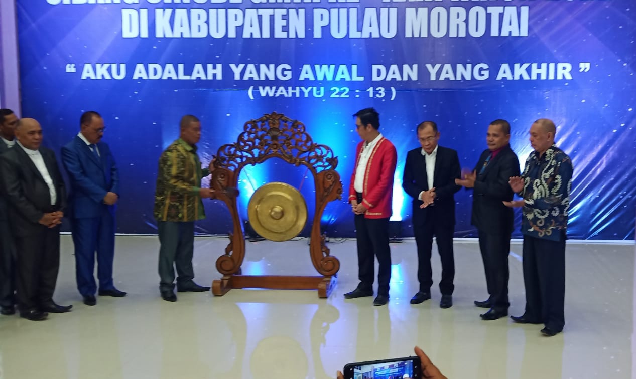 MOROTAI,HR— Mewakili Gubernur Maluku Utara (Malut), Staf Ahli Gubernur Malut, Andrias Thomas, membuka secara resmi Sidang Sinode Gereja Masehi Injil Halmahera (GMIH) yang ke-29, tahun 2022 di Gedung Morotai Christian Center (MCC) Desa Gotalamo Kecamatan Morotai Selatan (Morsel), Kamis (05/05/2022) malam tadi ditandai dengan Pemukulan Gong sebagai tanda Sidang Sinode ke-XXIX GMIH di mulai.