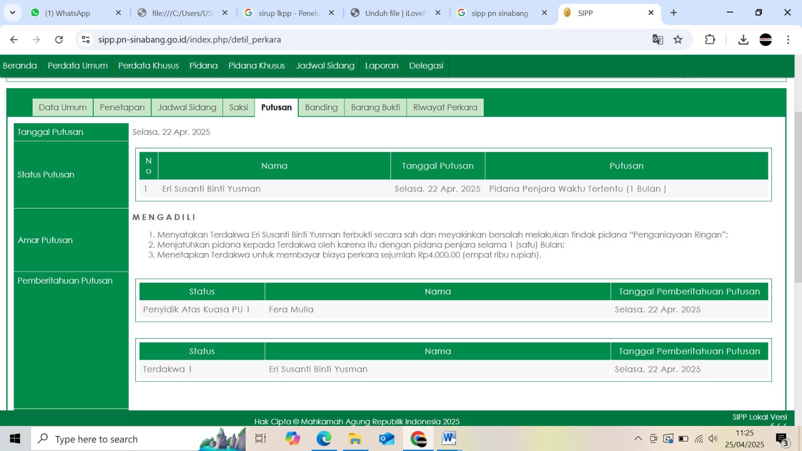 Dilihat pada Sistem Informasi Penelusuran Perkara (SIPP) Pengadilan Negeri Sinabang. Jum’at, (25/04/2025). Putusan terhadap terdakwa Eri Susanti diputuskan pada selasa 25 April 2025 kemarin.