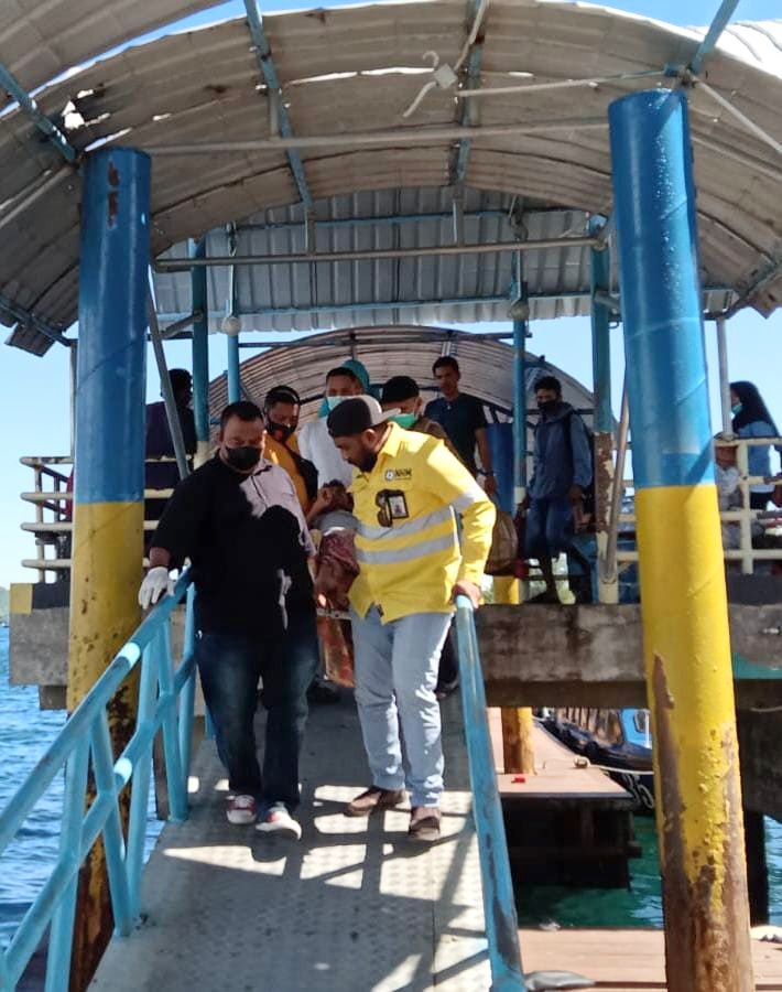 Tim Haji Robert Peduli PT Nusa Halmahera Minerals (PTNHM) menerimanya di pelabuhan Ternate dan kemudian dibawa ke RSUD Chasan Bosoeri Ternate.