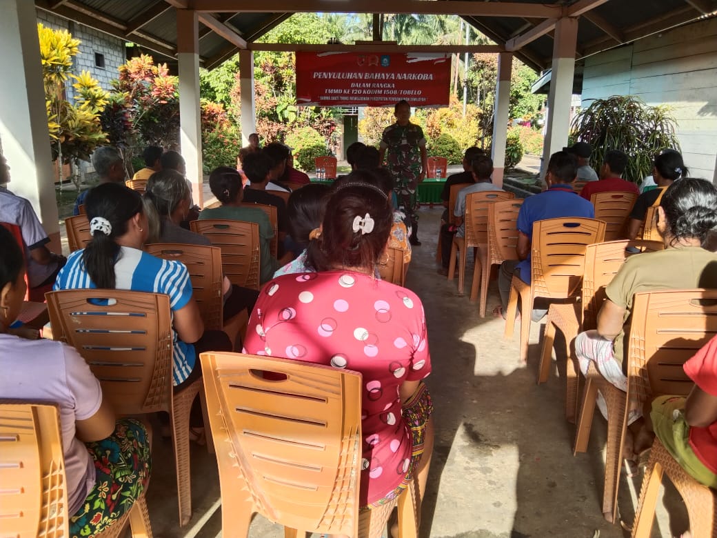 TOBELO, HR — Pelaksanaan TNI Manunggal Membangun Desa (TMMD) Ke-120, Kodim 1508/Tobelo mengadakan penyuluhan bahaya narkoba untuk masyarakat di Desa Teru-Teru, Kecamatan Loloda Utara, Kabupaten Halmahera Utara, Senin (20/05/2024).