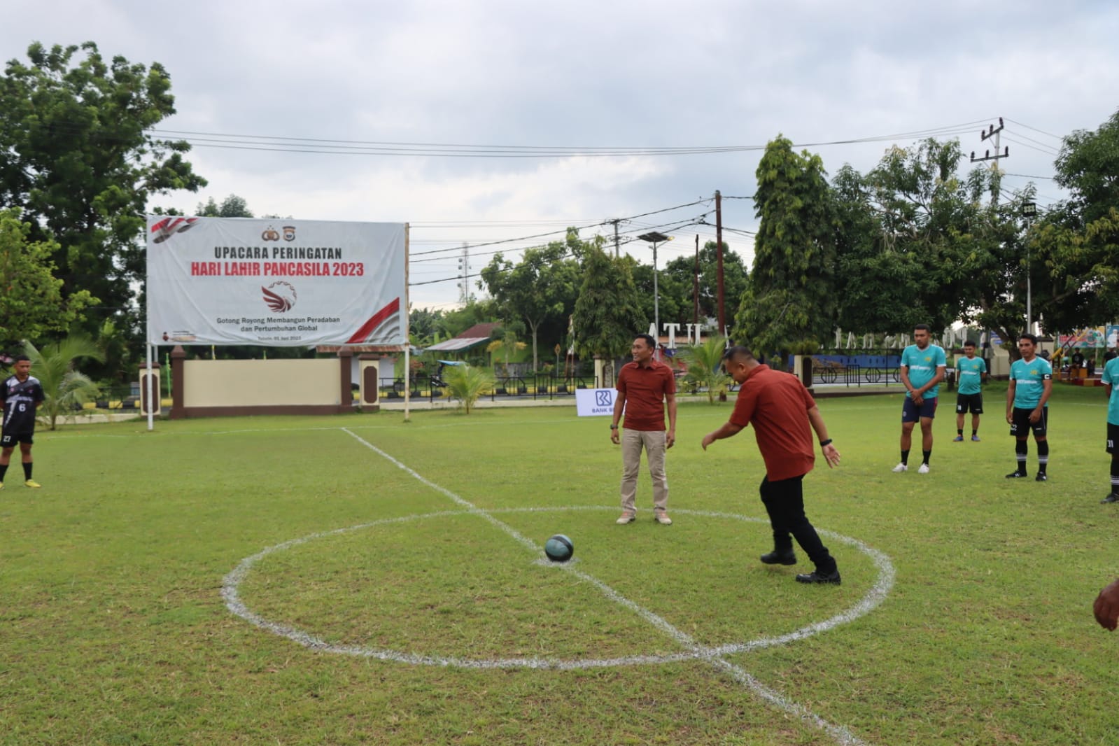 TOBELO, HR — Kapolres Halmahera Utara AKBP Mohammad Zulfikar Iskandar bersama Dandim 1508/Tobelo Letkol Inf Davit Sutrisno Sirait melakukan tendangan bola perdana (Kick Off) sebagai tanda kompetisi turnamen bola kaki memperebutkan piala Kapolres Cup VII 2023 resmi bergulir. Minggu (18/06/2023).