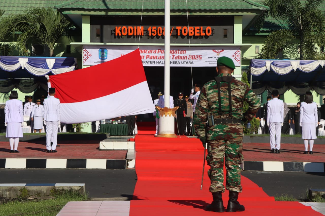 TOBELO, HR — Dalam rangka memperingati Hari Lahir Pancasila Tahun 2025, Kodim 1508/Tobelo bersama Pemerintah Kabupaten Halmahera Utara menggelar upacara resmi yang berlangsung di Lapangan Upacara Makodim 1508/Tobelo, Jalan Kawasan Pemerintahan Desa MKCM, Kecamatan Tobelo, Kabupaten Halmahera Utara sebagai bentuk penghormatan terhadap nilai-nilai luhur Pancasila sebagai dasar negara dan ideologi bangsa. Minggu, (01/06/2025)