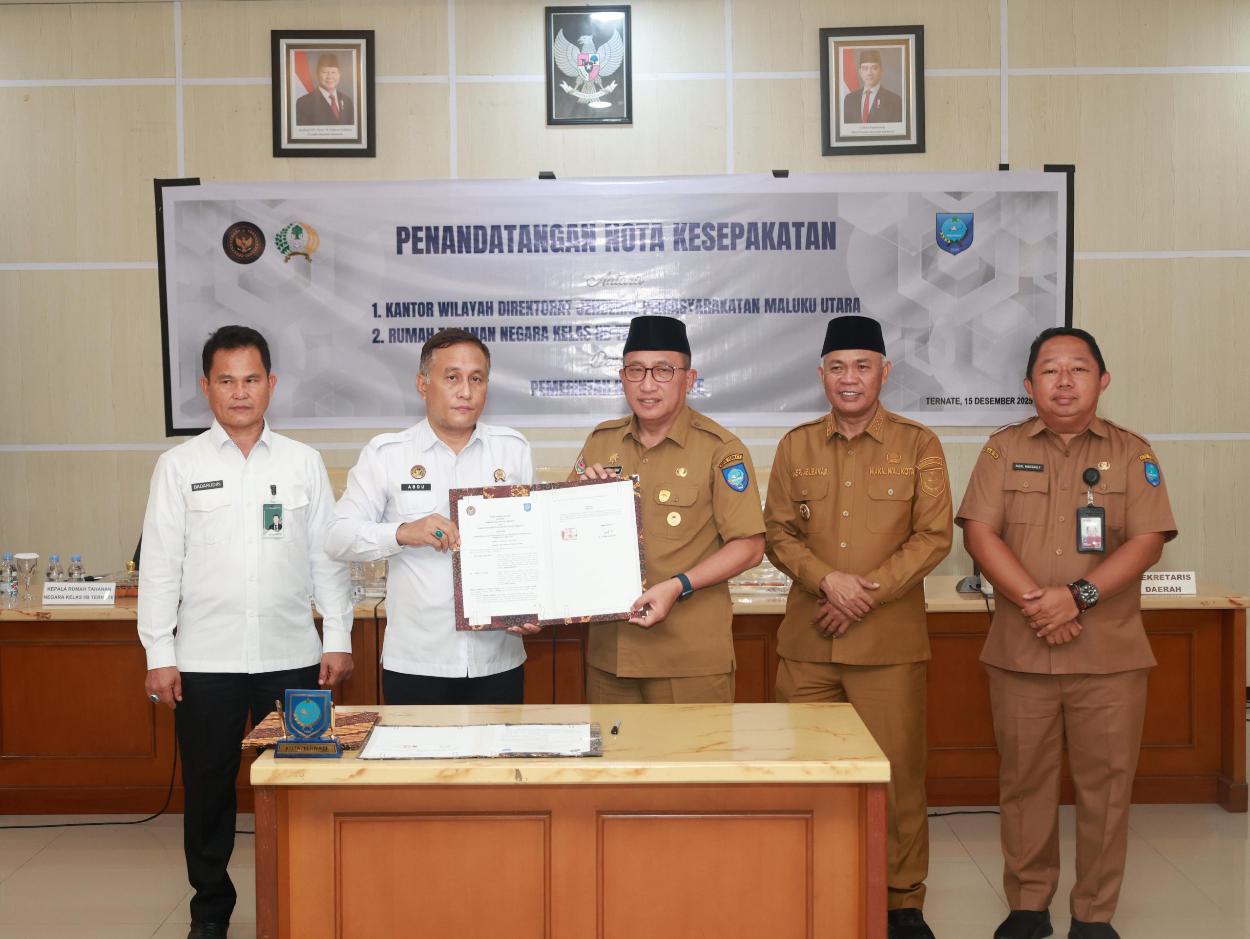 TERNATE, HR – Pemerintah Kota Ternate melakukan penandatanganan nota kesepakatan (MoU) dan rencana kerja dengan Kantor Wilayah Direktorat Jenderal Pemasyarakatan Maluku Utara, dan Rumah Tahanan Negara (Rutan) Kelas IIB Ternate, di Aula Lantai II Kantor Wali Kota Ternate, Senin (15/12/2025).