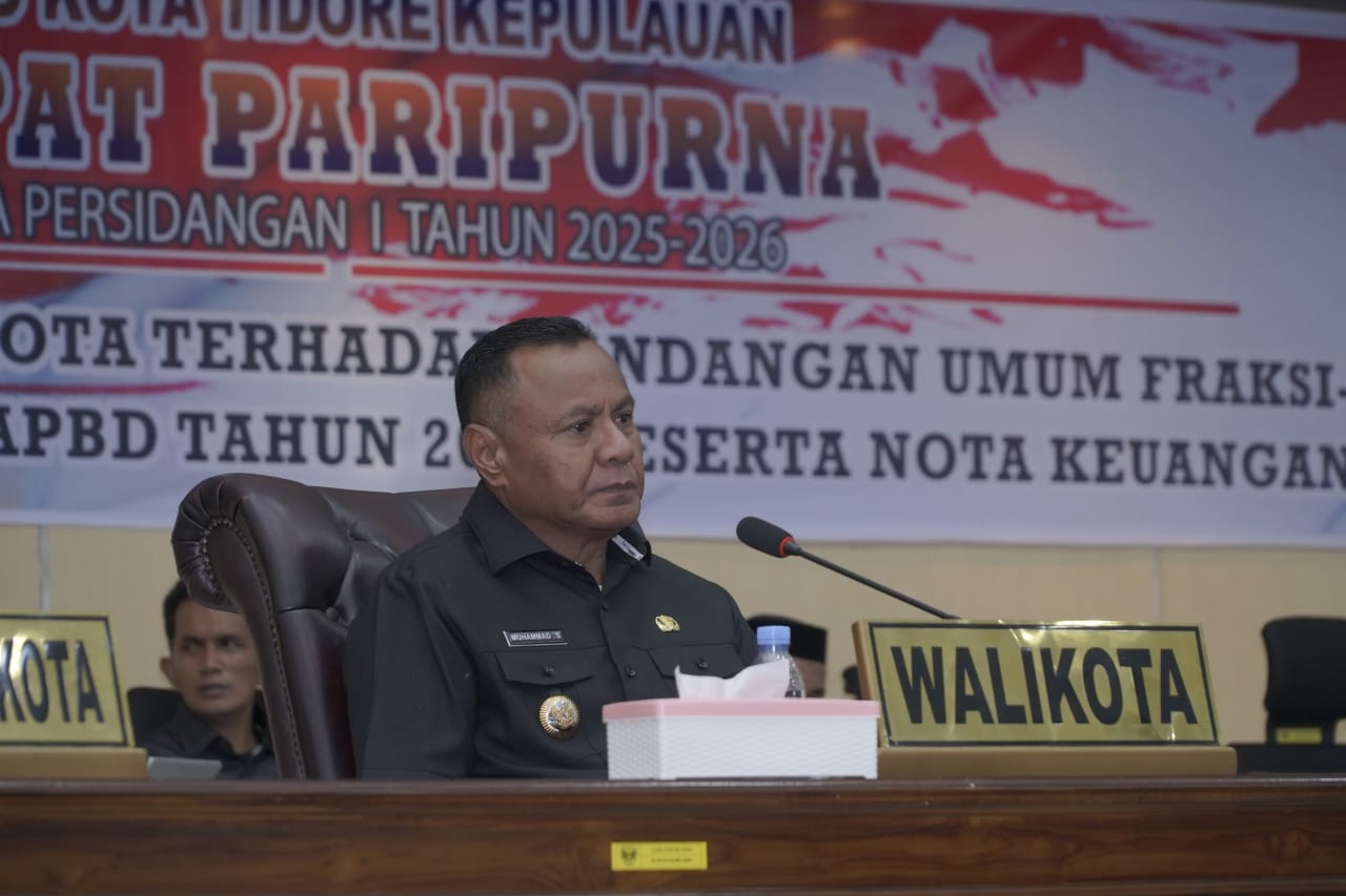 TIDORE, HR – Setelah mendengarkan dan mencermati pandangan umum fraksi- fraksi atas Rancangan Peraturan Daerah tentang APBD tahun Anggaran 2026 beserta nota keuangannya, Wali Kota Tidore Kepulauan Muhammad Sinen kembali hadir dan menyampaikan secara garis besar tiga aspek yang menjadi perhatian, saran dan masukan dari Fraksi DPRD.