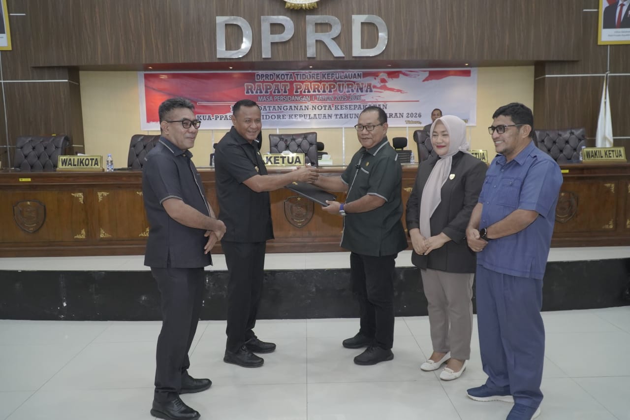 TIDORE, HR – Wali Kota Tidore Kepulauan Muhammad Sinen bersama Wakil Wali Kota Ahmad Laiman dan pimpinan Dewan Perwakilan Rakyat Daerah (DPRD) Kota Tidore Kepulauan menandatangani Nota Kesepakatan Kebijakan Umum Anggaran (KUA) dan Prioritas Plafon Anggaran Sementara (PPAS) tahun 2026.