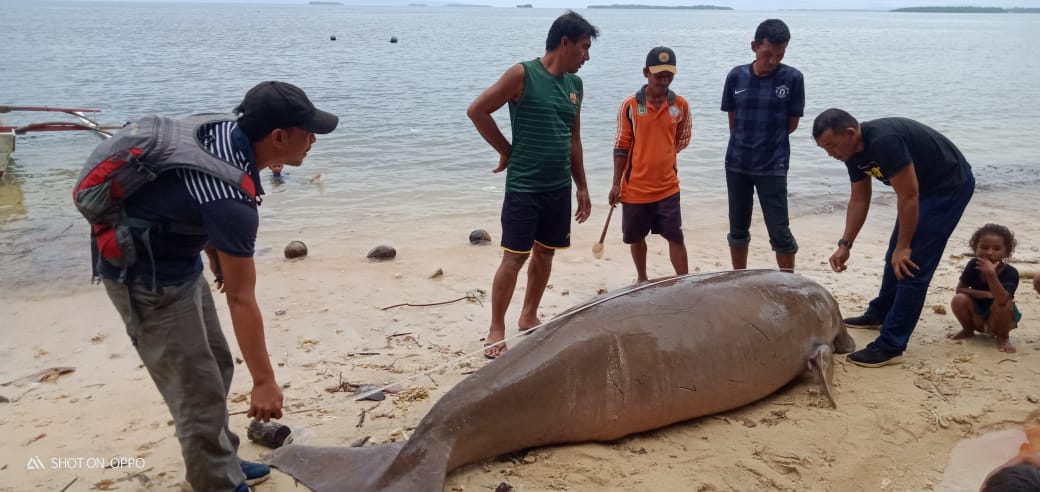Ikan Dugong dengan panjang 3 meter, lebar sirip ekor 1 meter, dan lebar badan 1,50 meter dengan bobot berat sekira 500 Kg lebih berjenis kelamin Betina itu ditemukan oleh Usman Turangan (45) warga Desa Juanga saat pulang melaut, Selasa (22/03/2022).
